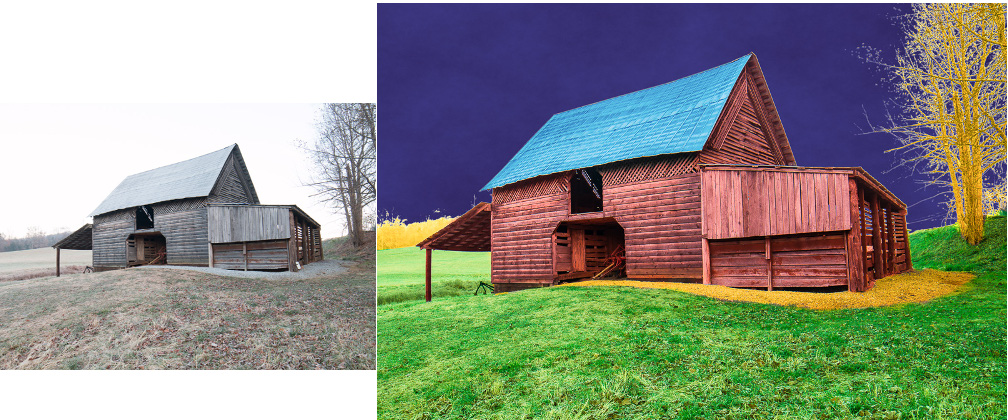 An interior designer came to me and asked me to photograph some local historic barns. But for her decorating concept she wanted them, “colored like an Andy Warhol painting.” Early one morning before any people or cars were out and about I took a clean, flat-skyed (archival even), photo of the barn and then set to work realizing our creation.